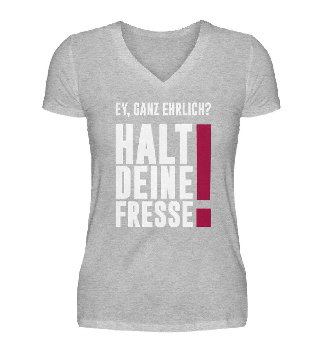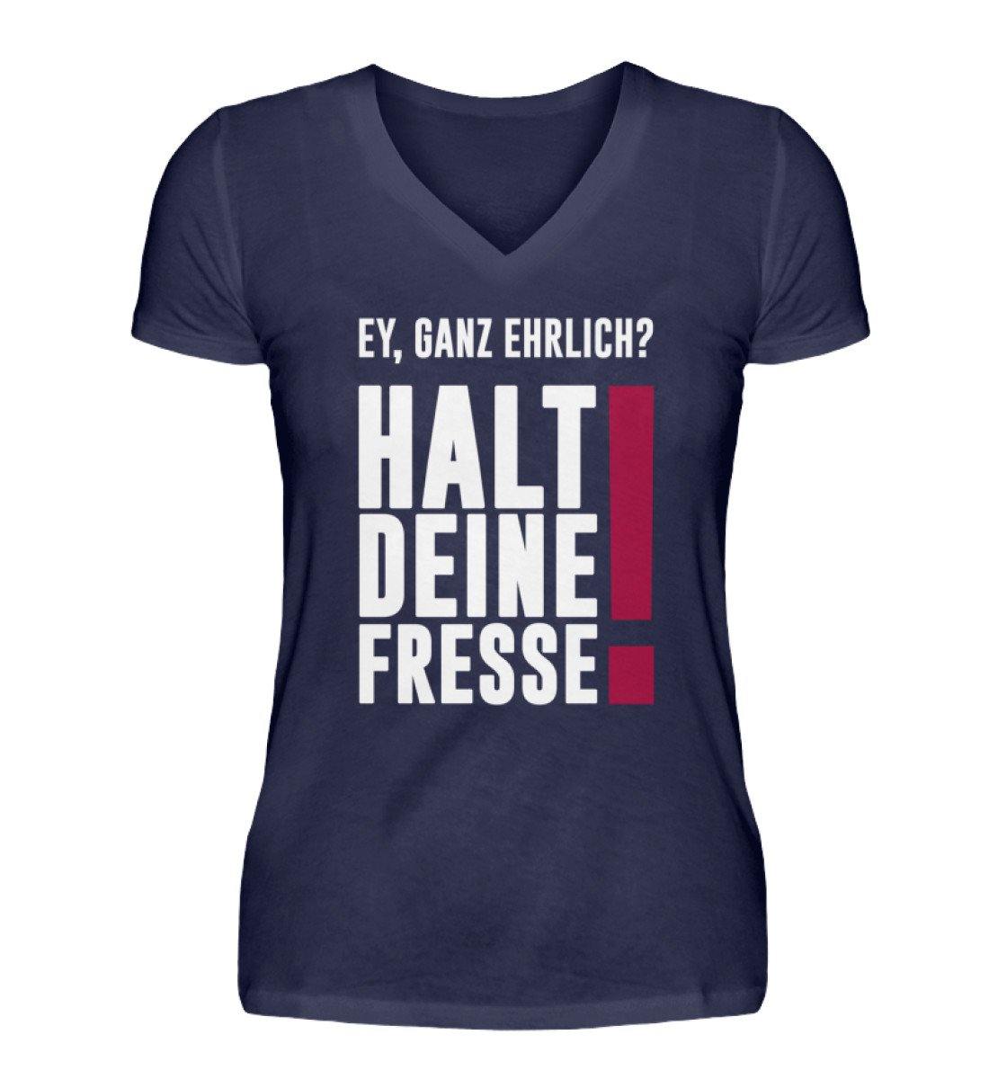 Ey ganz ehrlich? Halt die Fresse! 2020  - V-Neck Damenshirt - Words on Shirts Sag es mit dem Mittelfinger Shirts Hoodies Sweatshirt Taschen Gymsack Spruch Sprüche Statement
